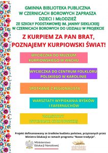 Zapraszamy dzieci i młodzież ze Szkoły Podstawowej im. Janiny Sieklickiej w Czernicach Borowych do udziału w projekcie pn. “Z Kurpiem za pan brat, poznajemy kurpiowski świat!”. Różnorodne działania zaplanowane w projekcie mają na celu przybliżenie uczestnikom bogatej kultury i tradycji sąsiedniego regionu kurpiowskiego.