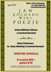 Gminna Biblioteka Publiczna w Czernicach Borowych oraz Biblioteka Szkoły Podstawowej im. Janiny Sieklickiej w Czernicach Borowych serdecznie zapraszają do udziału w XIV odsłonie Narodowego Czytania 10 września 2025 r. o godzinie 10.00.