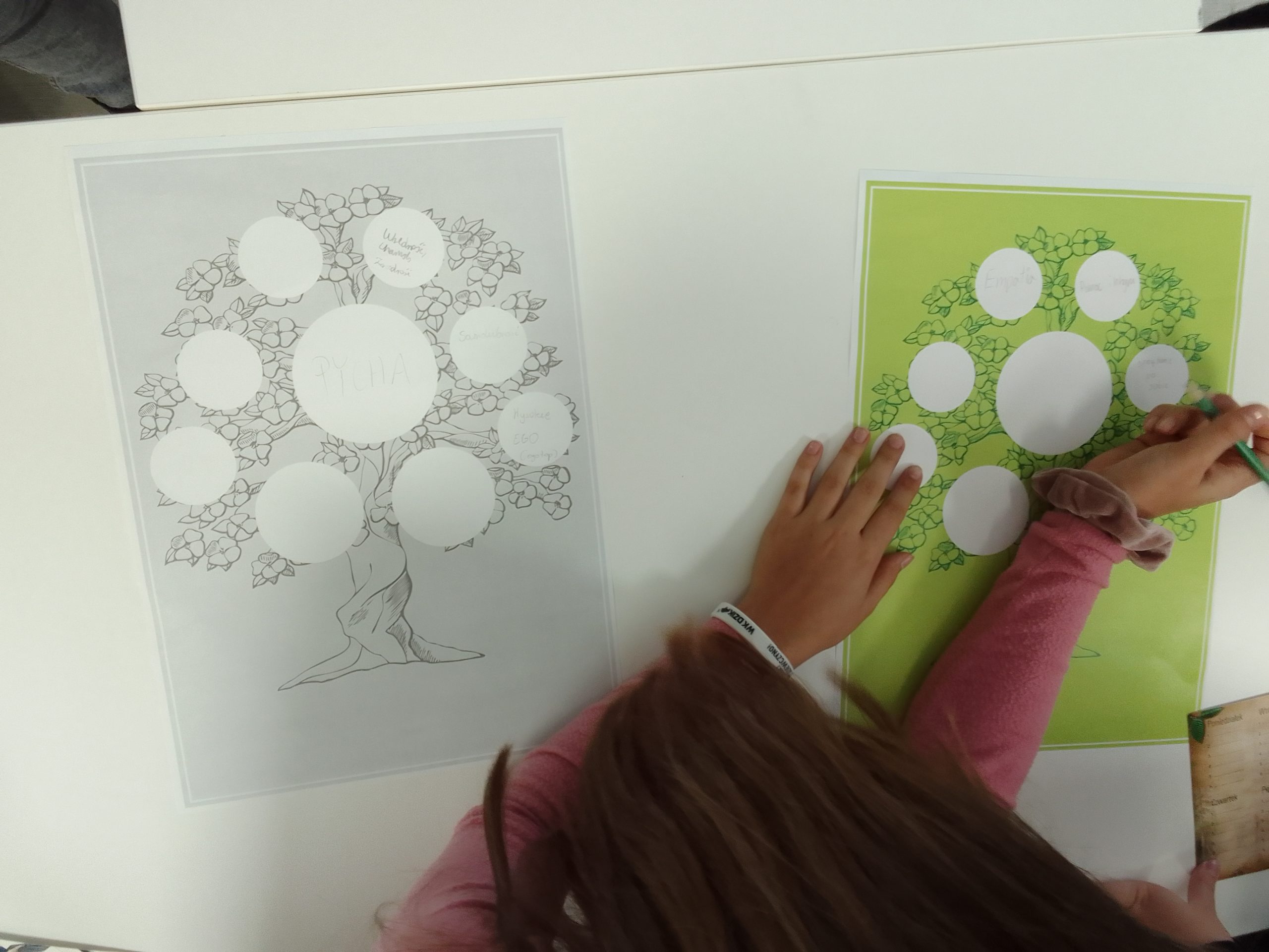 W kolejnej części spotkania wykonaliśmy zadanie „Drzewo”. Uczestnicy otrzymali dwie kartki, na których były wydrukowane drzewa, jedno w żywym zielonym kolorze, oznaczające dobro i zrozumienie oraz drugie – szare, oznaczające przykrość i brak zrozumienia. Zadanie polegało na zapisaniu na każdym drzewie wyrazów, którymi często określamy ludzi, których nie znamy i nie wiemy jacy są. Następnie omówiliśmy zapisane pomysły.