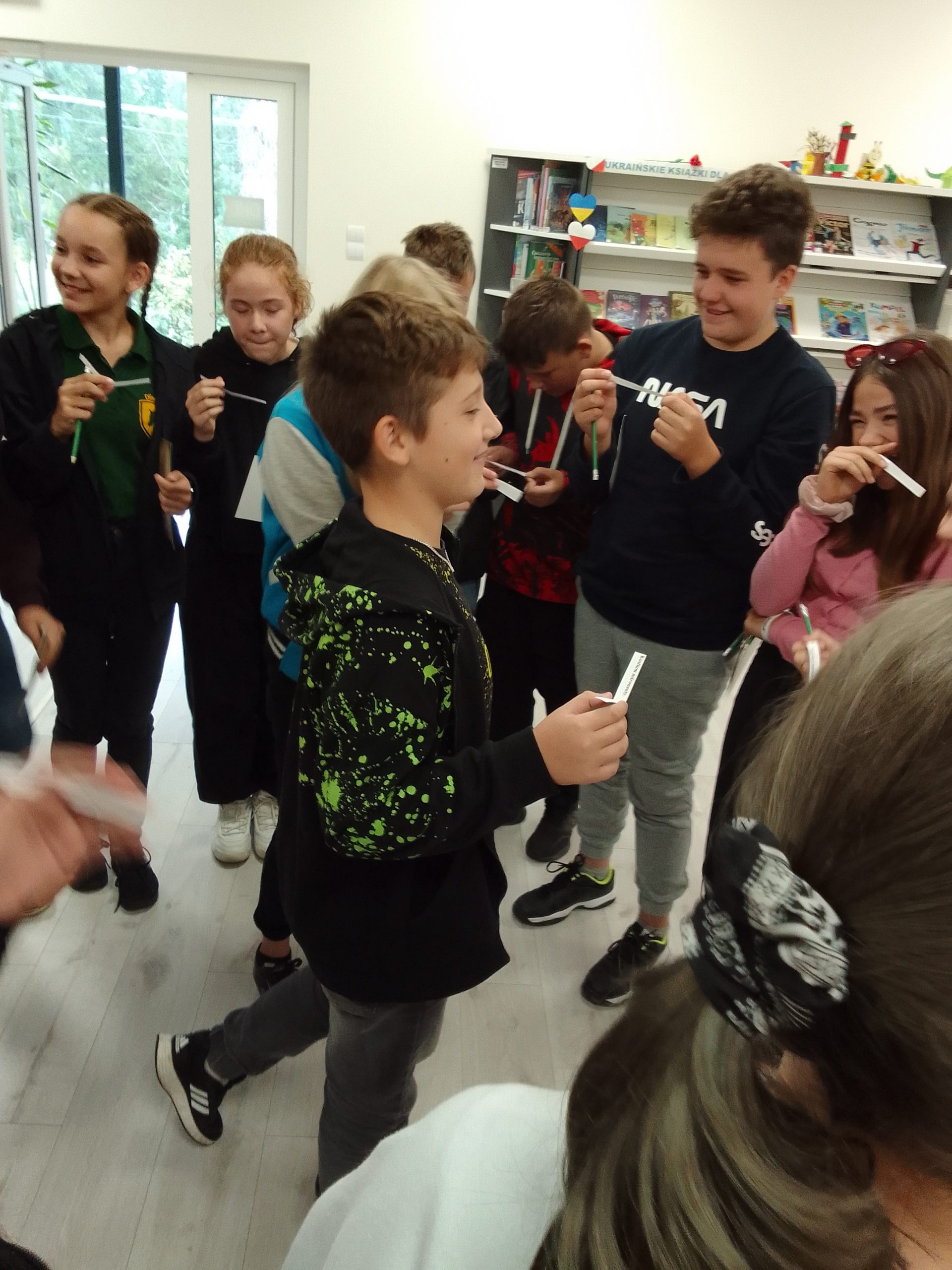 Na zakończenie spotkania wykonaliśmy ćwiczenie „Uwaga hałas – wszyscy mówią na raz”. Każdy uczeń wylosował hasło do powiedzenia. Wszyscy ustali w kręgu, a do środka zaprosiliśmy dwie chętne osoby. Na trzy-cztery, osoby tworzące krąg zaczęły głośno czytać wylosowane hasła, zaś osoby w środku starały się cokolwiek zrozumieć. To było bardzo dobre ćwiczenie, które zakończyliśmy rozmową na temat odczuć.