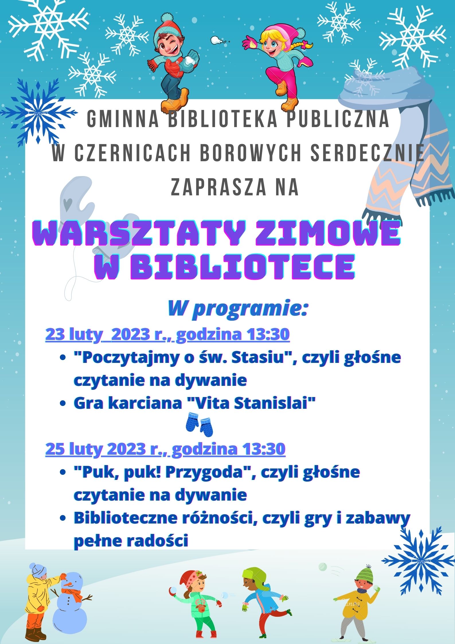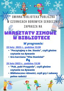 Zapraszamy dzieci na warsztaty zimowe w bibliotece 23.02.2023 r. (czwartek) oraz 25.02.2023 r. (sobota), godzina 13:30.