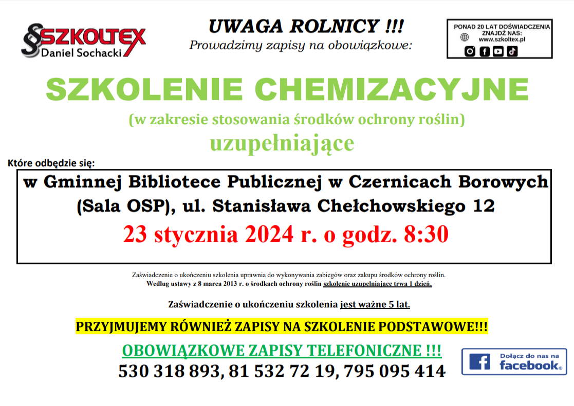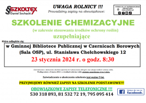 Szkolenie chemizacyjne dla rolników – zapisy Opublikowano 22 grudnia 2023 Dodaj komentarz Anuluj pisanie odpowiedziMusisz się zalogować, aby móc dodać komentarz.