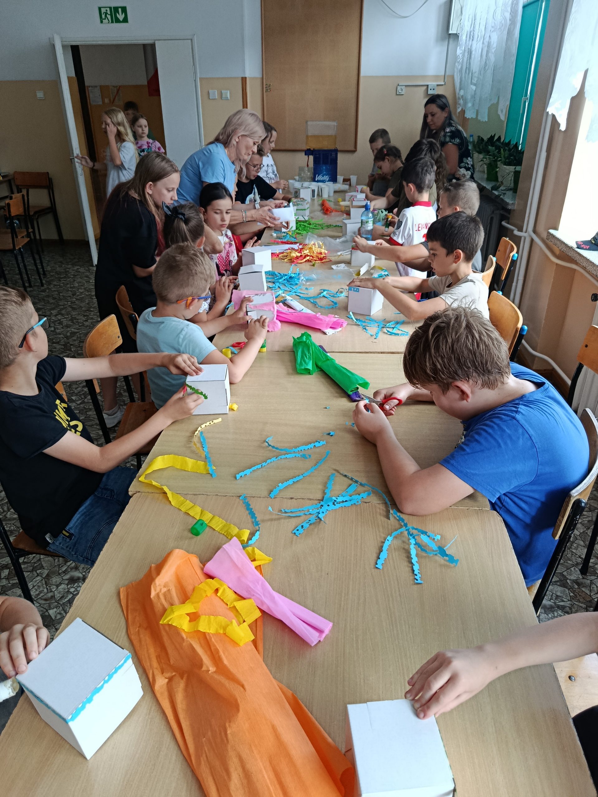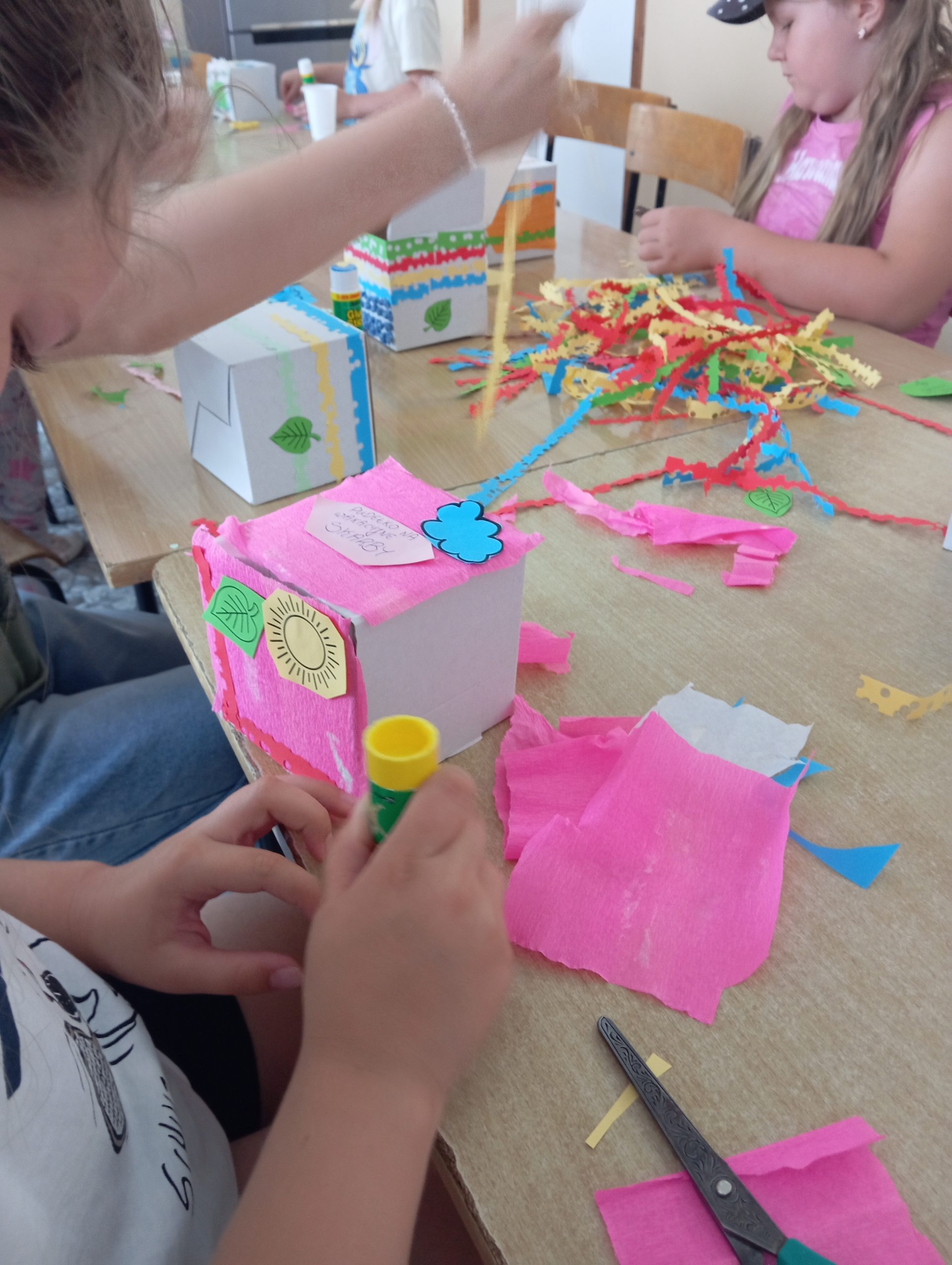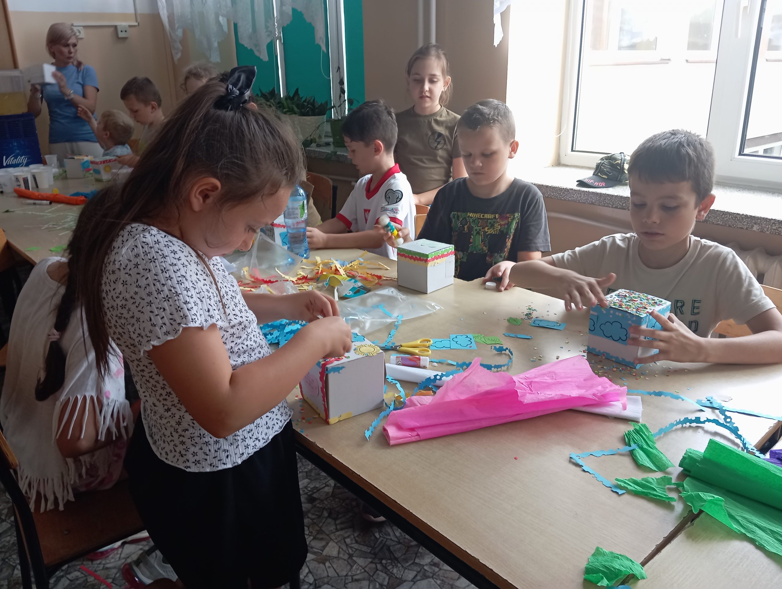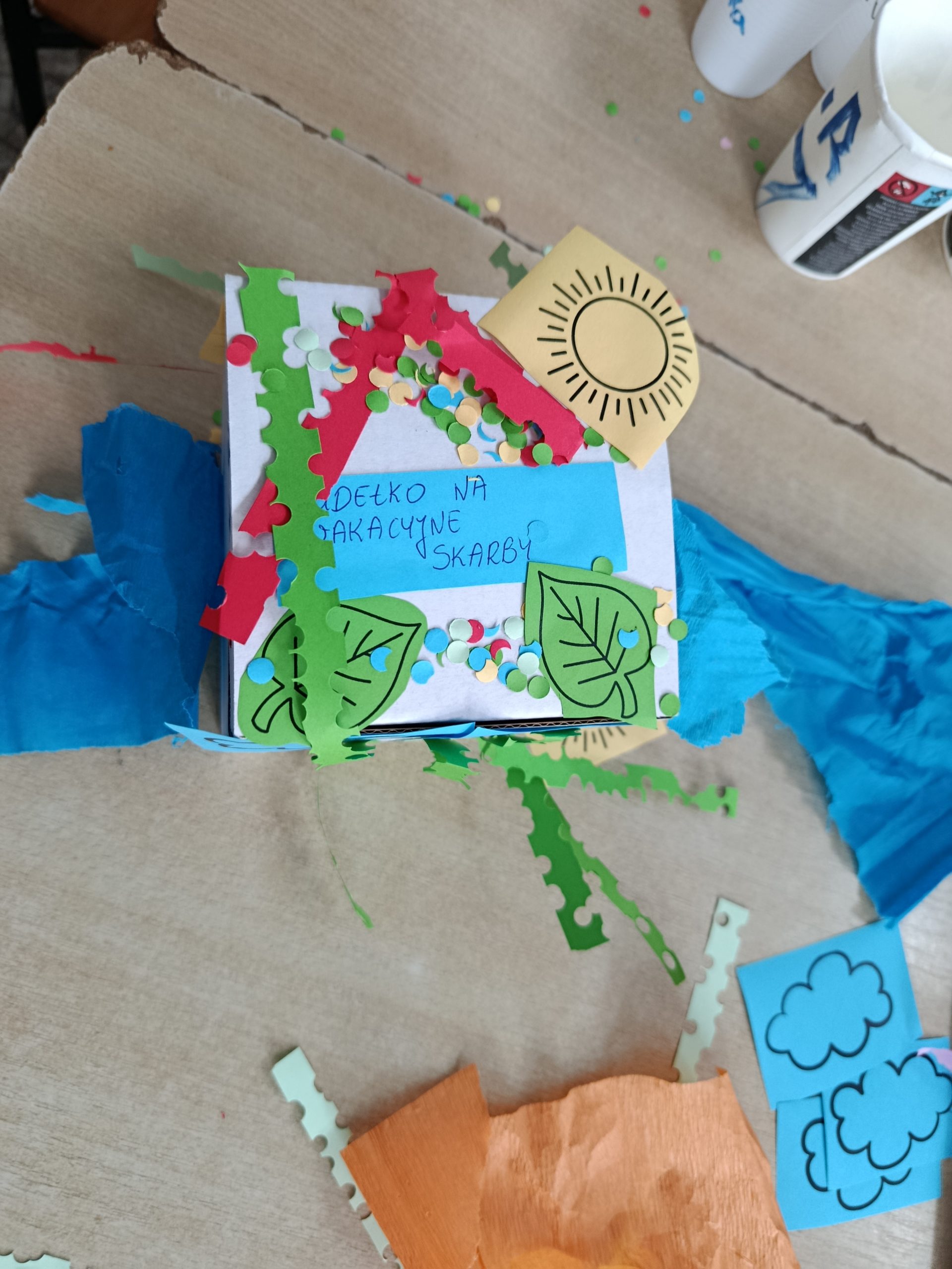 Kolejnym etapem warsztatów była część plastyczna – uczestnicy wykonali własne pudełka wakacyjnych skarbów z kartonowych opakowań, dając im tym samym „drugie życie”. Przy pomocy kolorowej bibuły, papieru, różnobarwnych kółeczek z dziurkacza i innych ozdób, każde dziecko stworzyło unikatowe pudełko, w którym będzie mogło przechowywać pamiątki z letnich przygód. Prace zachwycały pomysłowością i starannością wykonania.