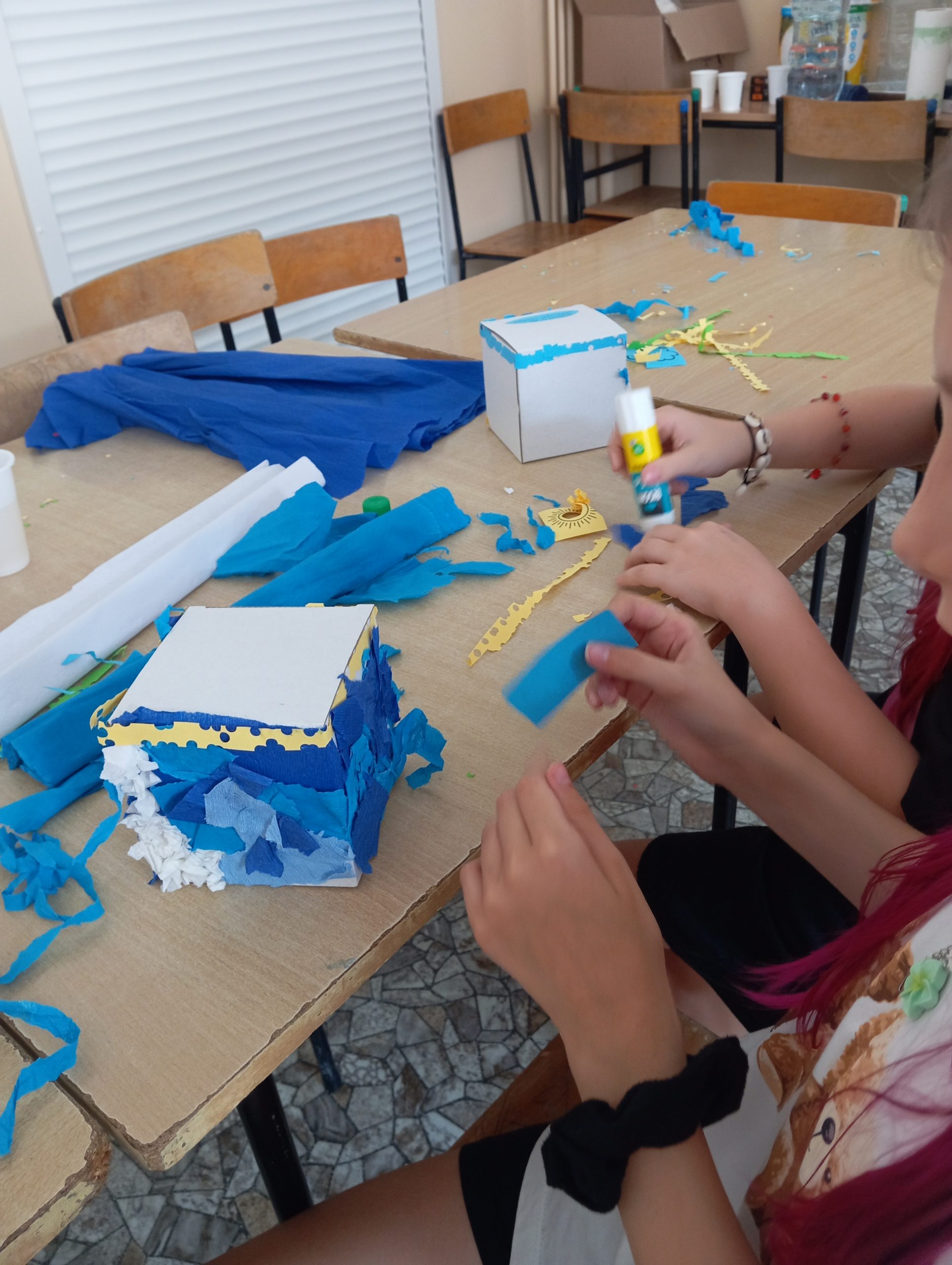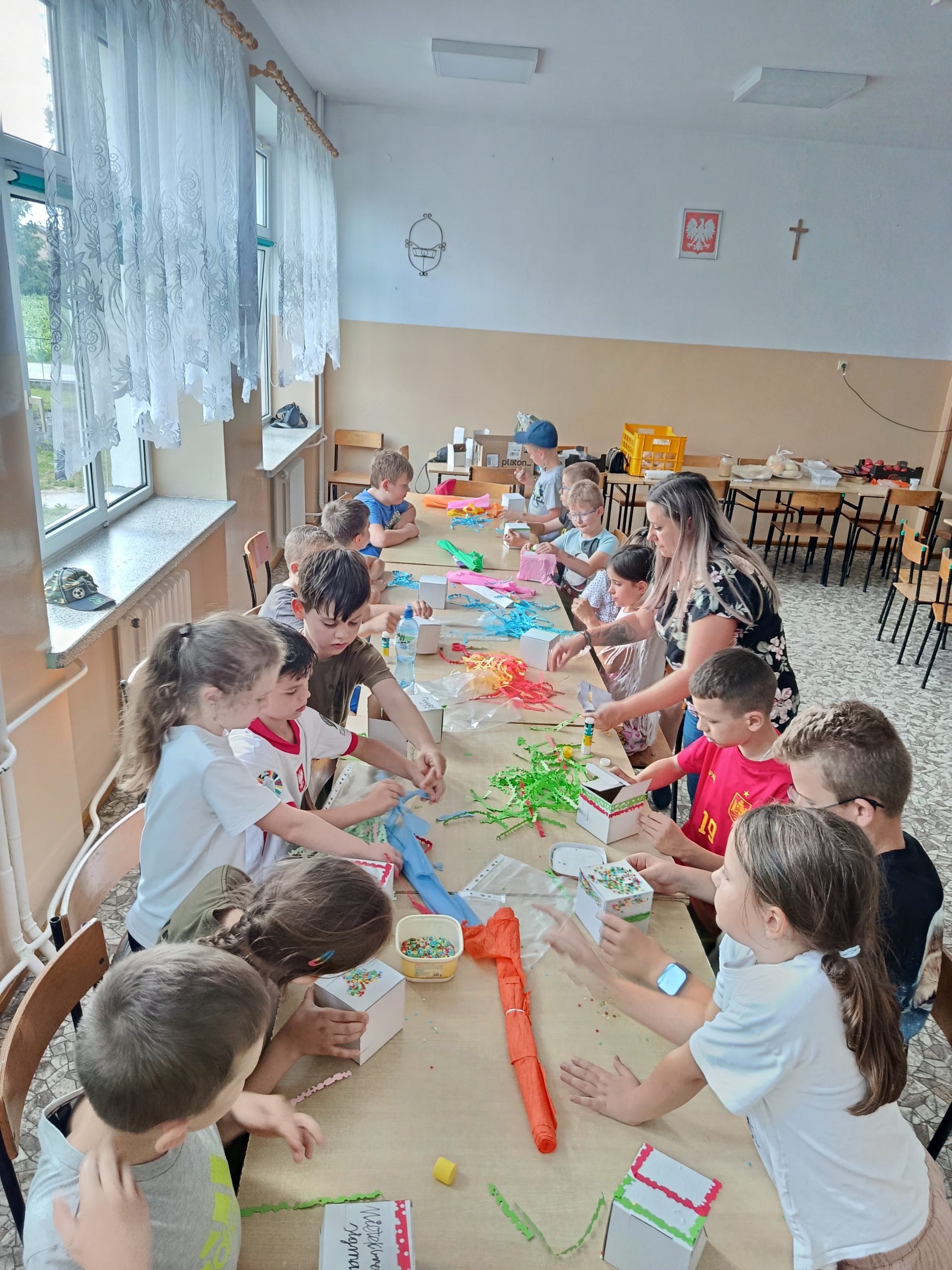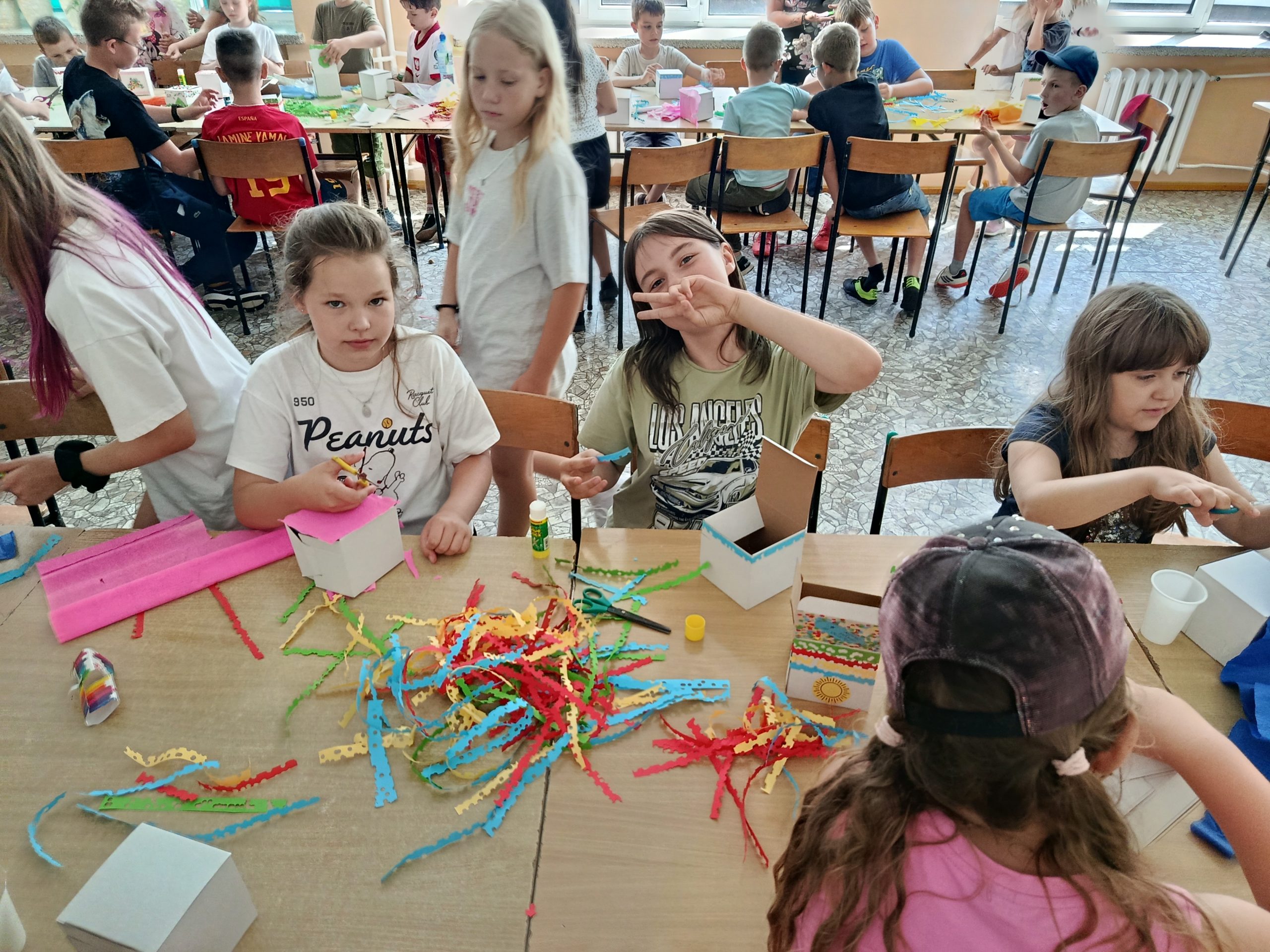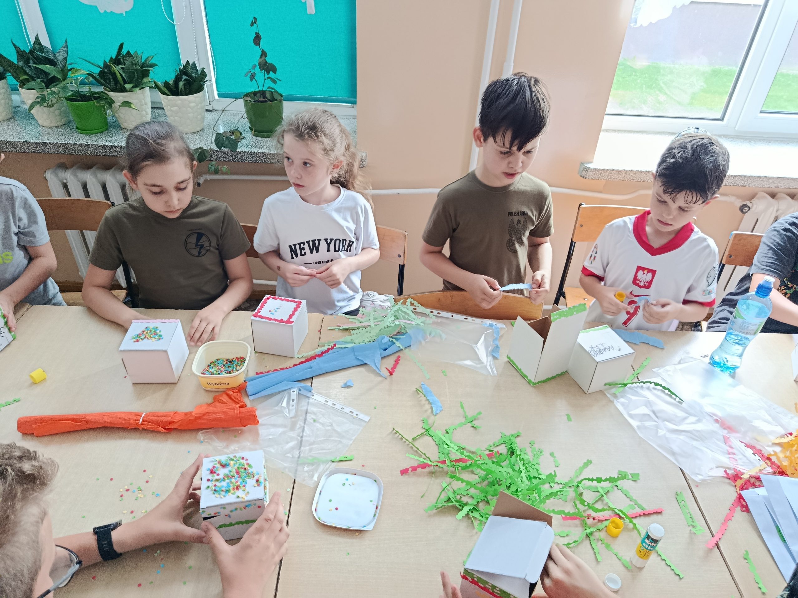 Kolejnym etapem warsztatów była część plastyczna – uczestnicy wykonali własne pudełka wakacyjnych skarbów z kartonowych opakowań, dając im tym samym „drugie życie”. Przy pomocy kolorowej bibuły, papieru, różnobarwnych kółeczek z dziurkacza i innych ozdób, każde dziecko stworzyło unikatowe pudełko, w którym będzie mogło przechowywać pamiątki z letnich przygód. Prace zachwycały pomysłowością i starannością wykonania.