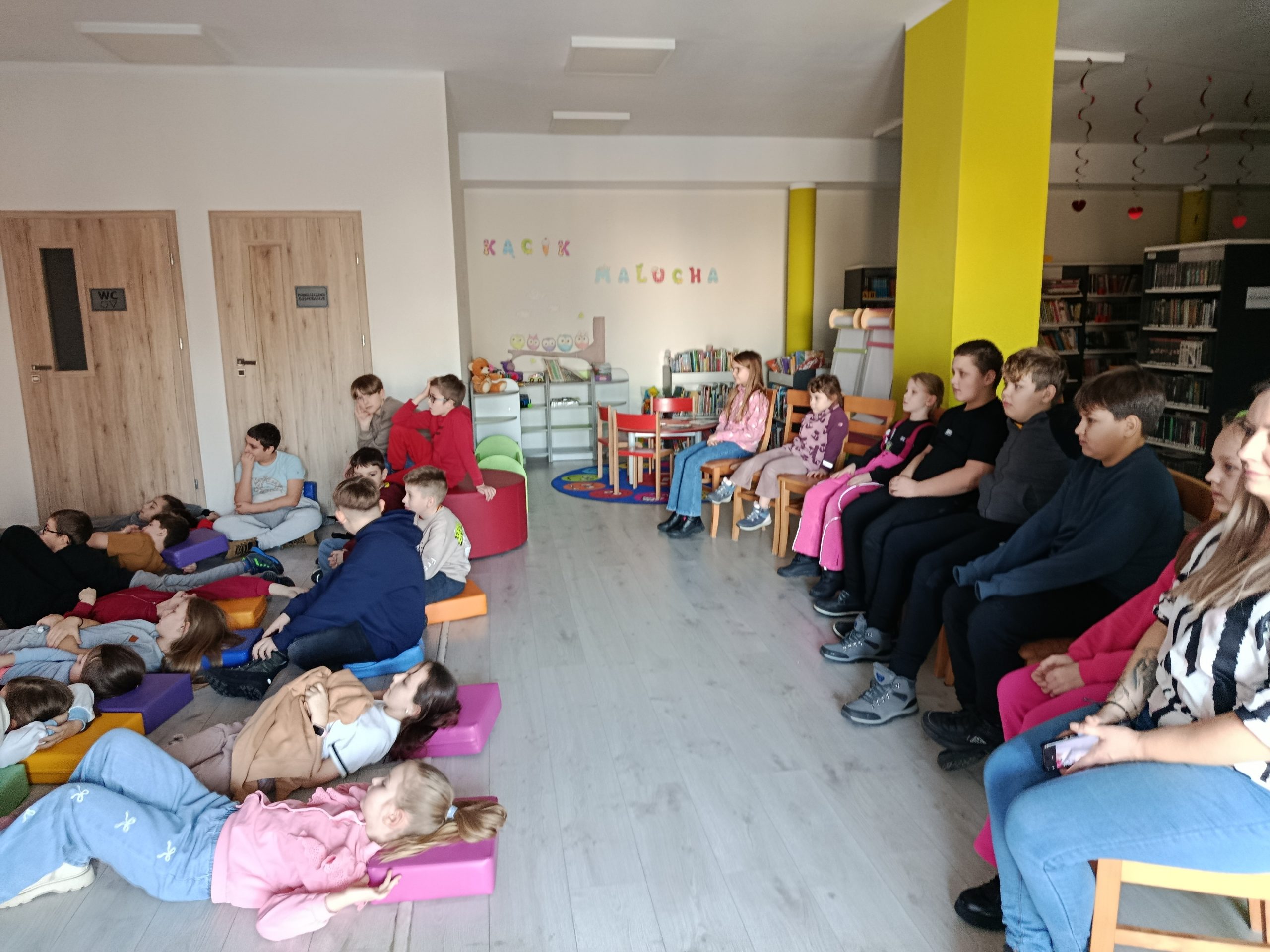 W dalszej części zajęć dzieci brały udział w grze planszowej oraz wykonywały tematyczne kolorowanki. Nie zabrakło również zabaw ruchowych, które pozwoliły na aktywność fizyczną, integrację grupy i dostarczyły wielu radosnych emocji. Na zakończenie spotkania uczestnicy obejrzeli bajkę o pingwinach wyświetlaną na dużym ekranie, co było miłym i radosnym podsumowaniem dnia.