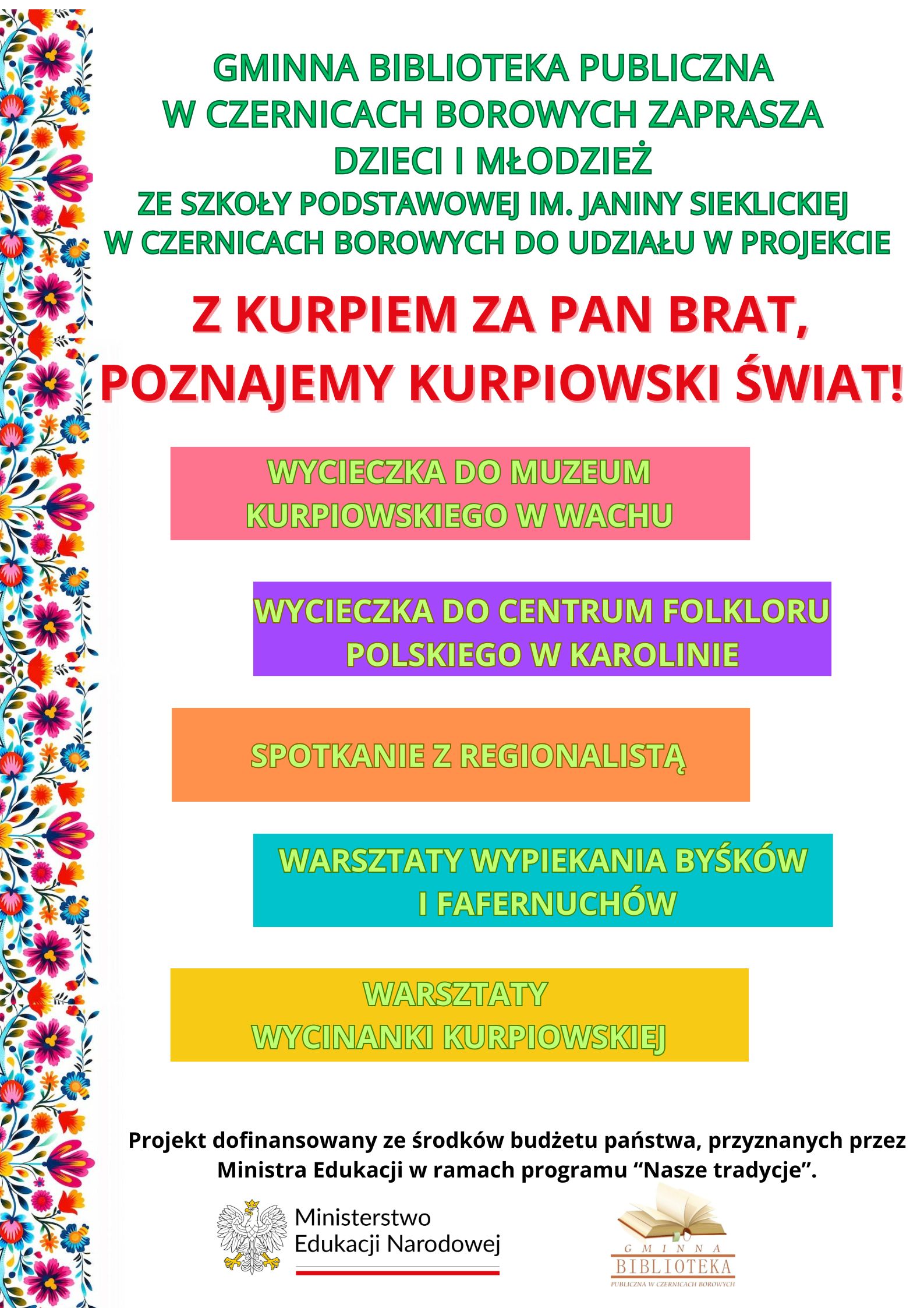 Zapraszamy dzieci i młodzież ze Szkoły Podstawowej im. Janiny Sieklickiej w Czernicach Borowych do udziału w projekcie pn. “Z Kurpiem za pan brat, poznajemy kurpiowski świat!”. Różnorodne działania zaplanowane w projekcie mają na celu przybliżenie uczestnikom bogatej kultury i tradycji sąsiedniego regionu kurpiowskiego.