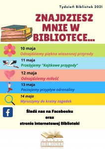 W sobotę 8 maja rozpoczynamy Tydzień Bibliotek 2021 pod hasłem “Znajdziesz mnie w bibliotece”. Data nie jest przypadkowa. 8 maja to bardzo ważne i szczególne święto – Ogólnopolski Dzień Bibliotekarza i Bibliotek. Zapraszamy wszystkich do udziału w przygotowanych aktywnościach. Każdego dnia, począwszy od 10 maja śledźcie nas na FB, stronie www oraz kanale YouTube. O szczegóły zapytajcie bibliotekarza.