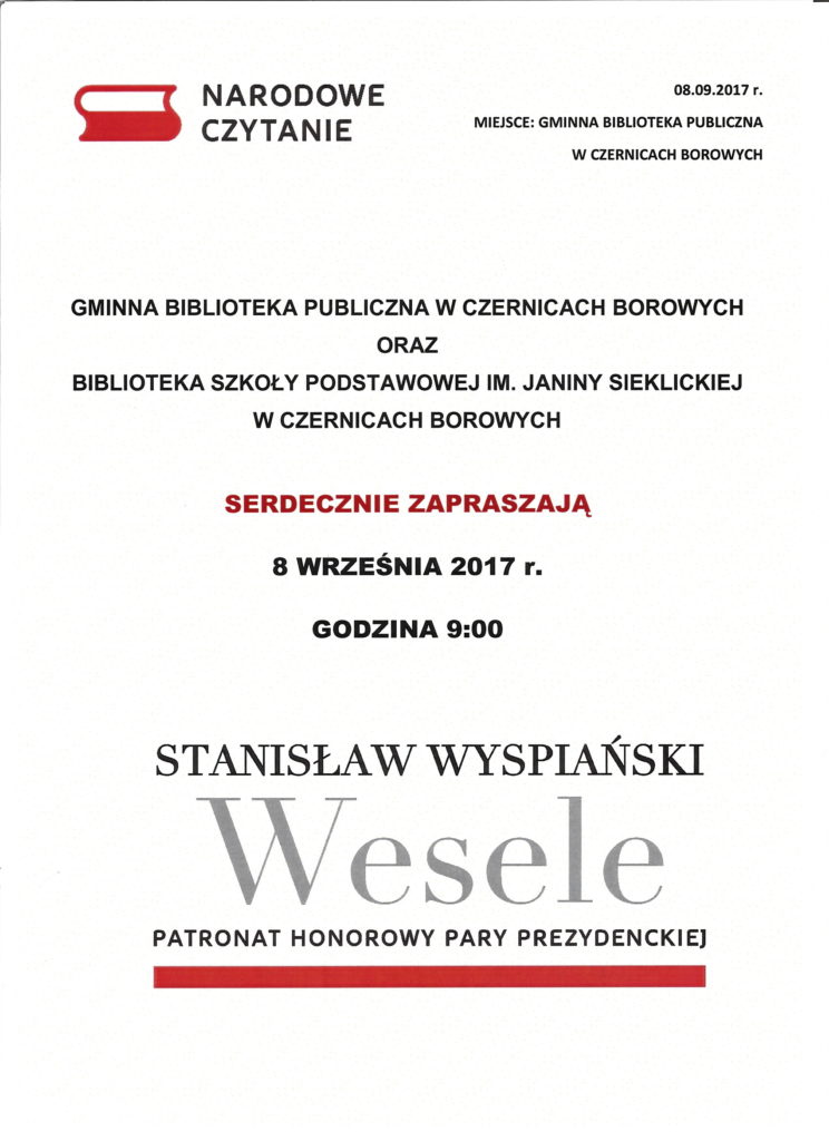 8 września 2017 r. w Gminnej Bibliotece Publicznej w Czernicach Borowych odbyło się Narodowe Czytanie. Tegoroczna edycja poświęcona była dziełu Wesele Stanisława Wyspiańskiego – poety, dramatopisarza, malarza, inscenizatora, jednego z najgenialniejszych polskich artystów. Wydarzenie miało dla nas szczególny wymiar. Po raz pierwszy Narodowe Czytanie zorganizowaliśmy wspólnie z Biblioteką Szkoły Podstawowej im. Janiny Sieklickiej w Czernicach Borowych.