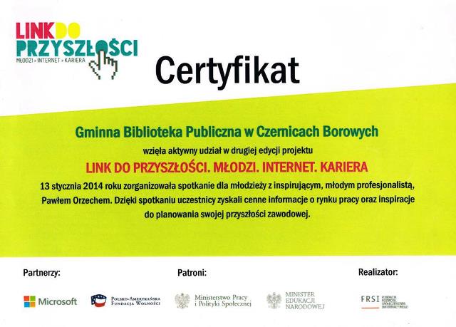 W dniach od 8 do 15 maja 2014 r. Gminna Biblioteka Publiczna w Czernicach Borowych obchodziła Tydzień Bibliotek. Tegorocznym hasło tej imprezy to: Czytanie łączy pokolenia. Akcja ta miała na celu podkreślanie roli czytania i bibliotek w poprawie jakości życia, edukacji oraz zwiększanie prestiżu zawodu bibliotekarza i zainteresowania książką szerokich kręgów społeczeństwa. W ramach obchodów w dwóch świetlicach wiejskich w Chojnowie i Czernicach Borowych zorganizowane zostały zajęcia edukacyjne dla dzieci i młodzieży. W czasie zajęć prowadzące Panie Magdalena Kuczyńska i Edyta Kunkowska, opowiedziały dzieciom w jaki sposób powstają książki, jaką rolę odgrywają one w życiu młodego człowieka. Dzieci w czasie zajęć wykonywały prace plastyczne w tym także książeczki.