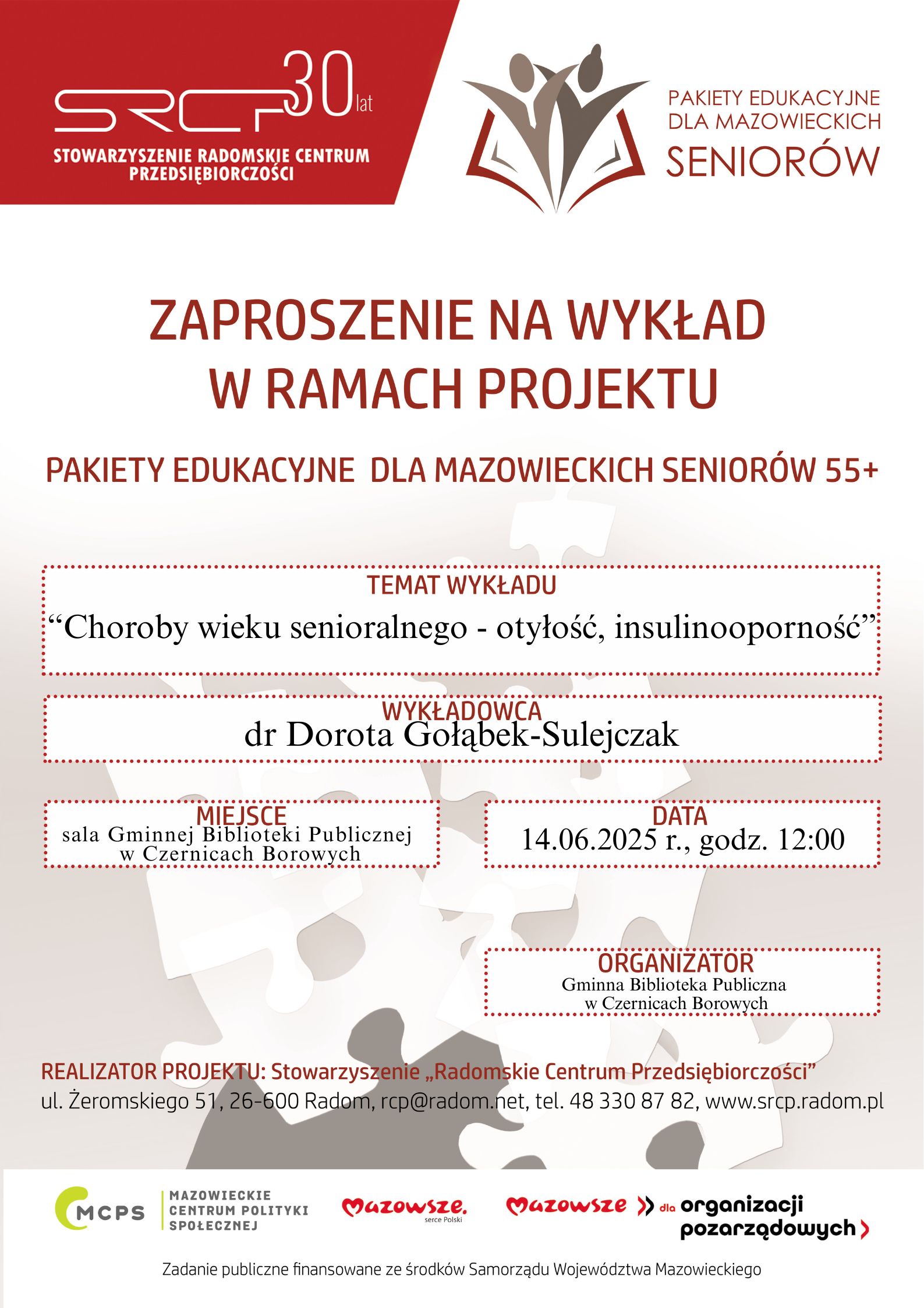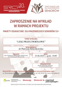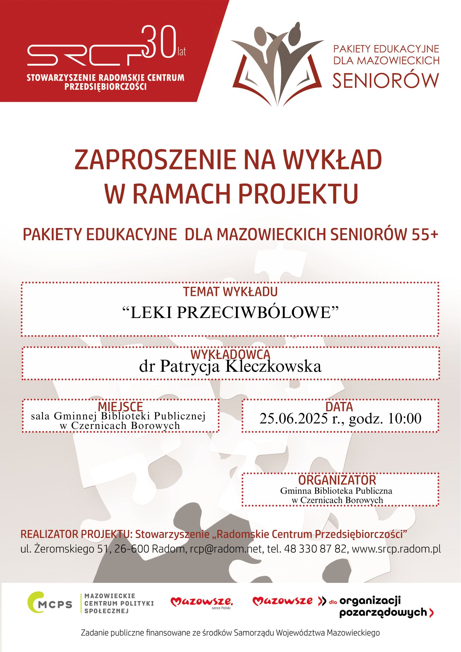 25 czerwca 2025 roku o godzinie 10:00 w sali Gminnej Biblioteki Publicznej w Czernicach Borowych odbyło się kolejne z cyklu spotkań edukacyjnych dla seniorów. Tym razem tematem przewodnim były leki przeciwbólowe, ich rodzaje, działanie oraz zasady bezpiecznego stosowania. Wydarzenie poprowadziła prof. dr hab. inż. Patrycja Kleczkowska, która specjalizuje się m.in. w edukacji zdrowotnej osób starszych.